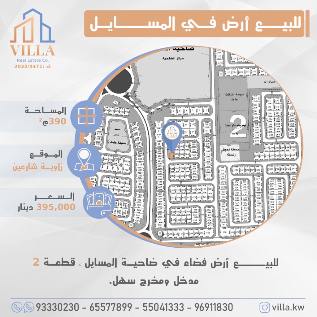 For sale, a vacant land in Al-Masayil suburb, plot 2, area 390 sqm, located at the corner of two streets, with easy access and exit. Price 395,000 Kuwaiti Dinars. For inquiries, mobile 1, mobile 2, mobile 3, mobile 4.