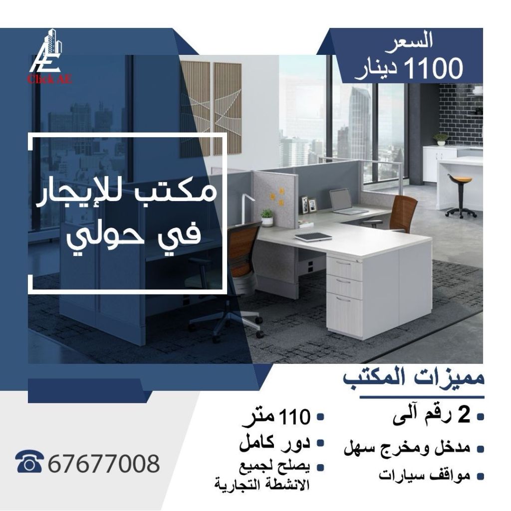 مكتب للإيجار في حولي، دور كامل، 110 متر مربع، تكييف مركزي، مجمع تجاري، رقمين، يصلح لجميع الأنشطة التجارية، مواقف سيارات، مدخل ومخرج سهل جداً، السعر 1100 دينار، للتواصل.