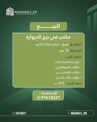 للإيجار: مكتب في برج الدروازة، شارع مبارك الكبير، منطقة مدينة الكويت. المساحة 70 متر مربع. يحتوي على غرفة اجتماعات ومكاتب للموظفين والمدير، ومؤثث بالكامل. سعر الإيجار 612 دينار كويتي. مطلوب خلو. لمزيد من التفاصيل، تواصل معنا من خلال الرابط في البايو.