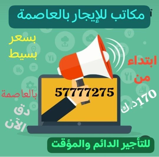 At a very low price starting from 170 Kuwaiti Dinars, rent your fully finished commercial office with all facilities. Various areas starting from 5 square meters in the capital. For contact.