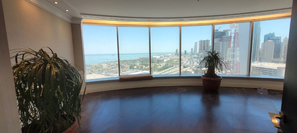 For rent, a distinguished commercial office in the capital, Al-Salhiya area, a well-known commercial tower, with a distinctive sea view, area of 500 square meters, 7 automatic elevators.