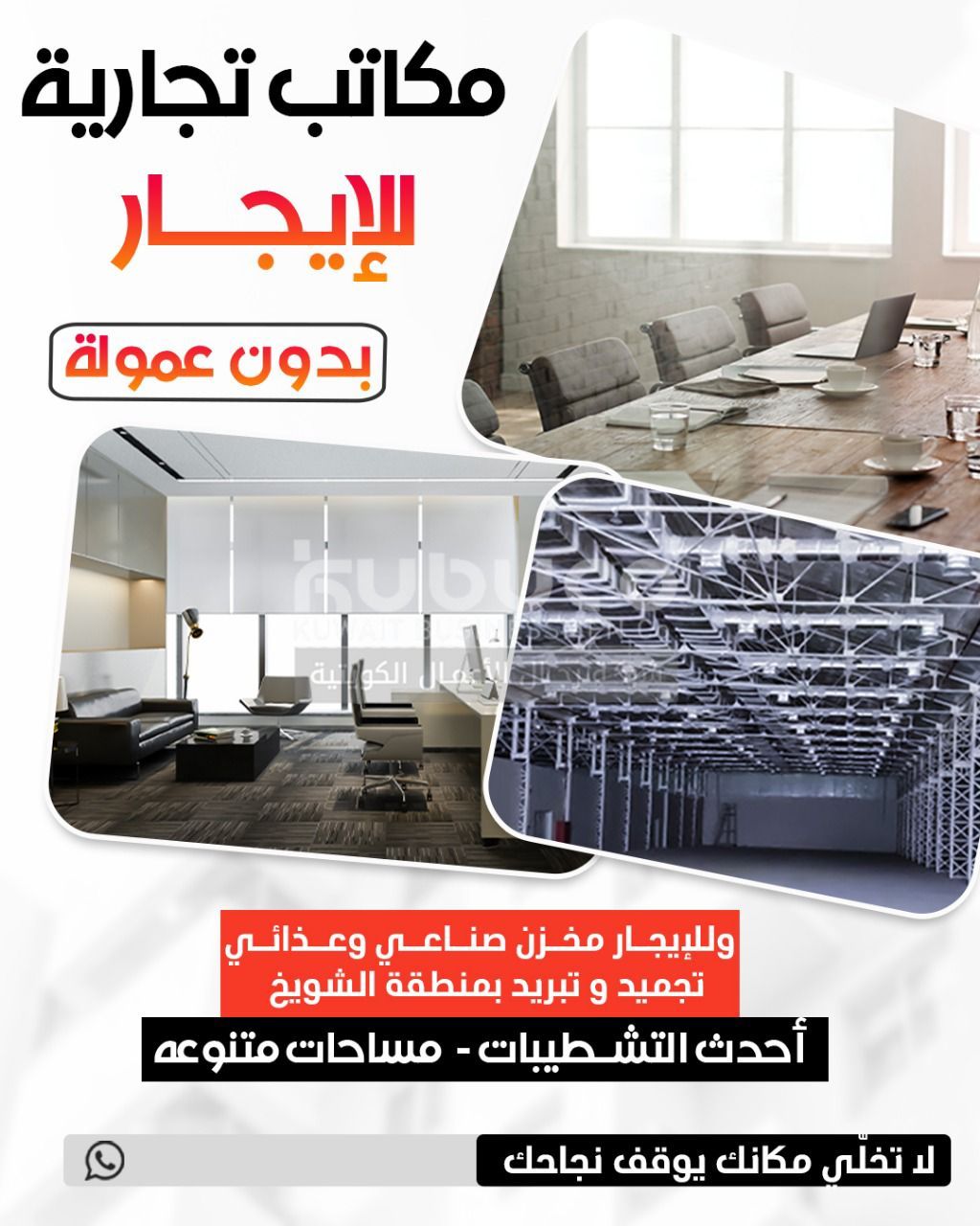 Commercial office for rent, consisting of a room and a hall. Elevator available. The office is ready and in a clean condition at an excellent price, with no commission. Located in the finest complexes in Al-Farees Mall, Al-Salmiya. Spaces suitable for your project.