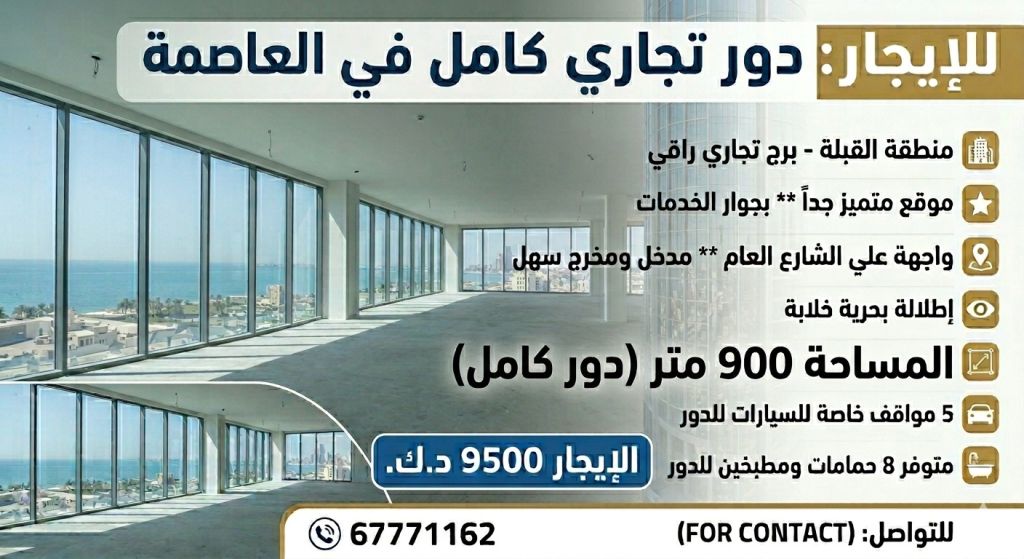 Commercial floor for rent in the capital - Al Qibla area, luxurious commercial tower, very prime location near services, easy entrance and exit, 5 private parking spaces per floor, sea view and facade on the main street, area 890 square meters, full floor, 8 bathrooms and two kitchens per floor, rent 9500 Kuwaiti dinars.