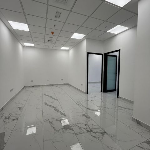 Office for rent with a grace period, first tenant in Al Qibla, Plot 13, area 65 SQM, new building, first tenant, 1 civil number, high - end finishing, very prime location. The office consists of 3 rooms, a bathroom, and a preparation kitchen, suitable for all commercial activities. Multiple floors are available, with prices varying by floor. A parking lot is available. Electricity is the tenant's
