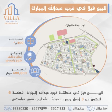 للبيع فيلا في منطقة غرب - عبدالله المبارك الصباح، قطعة 6، المساحة 400م، الموقع بطن وظهر، شارع رئيسي، تتكون من 3 أدوار وربع، جديدة، تشطيب سوبر ديلوكس. السعر 480000 دينار كويتي للاستفسار نقال 1 نقال 2 نقال 3