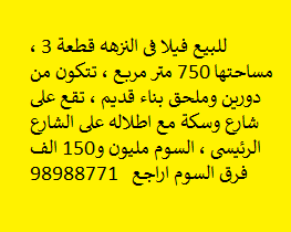للبيع فيلا في النزهه قطعة 3، مساحتها 750 متر مربع، تتكون من دورين وملحق بناء قديم، تقع على شارع وسكة مع اطلالة على الشارع الرئيسي، السوم 1150000 فرق السوم أراجع