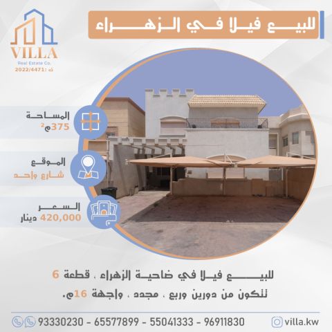 للبيع فيلا في ضاحية الزهراء، قطعة 6، المساحة 375 متر مربع، الموقع شارع واحد، تتكون من دورين وربع، مجدد، واجهة 16 متر. السعر 420,000 دينار كويتي. للاستفسار، نقال 1، نقال 2، نقال 3، نقال 4.