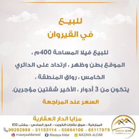 For sale: A villa in the Al-Qayrawan area with an area of 400 square meters. The location is front and back, setback on the Fifth Ring Road, in the corridor area. It consists of 3 floors, with the last floor having two rented apartments. For serious buyers only, and brokers are prohibited. Price upon review. For inquiries, contact via mobile.