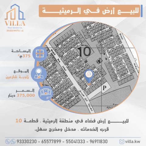 For sale, a vacant land in the Al-Rumaithiya area, plot 10, area 375 square meters, located at the corner of two streets, close to services, with easy access and exit. Price 375,000 Kuwaiti Dinars. For inquiries, mobile 1, mobile 2, mobile 3, mobile 4.