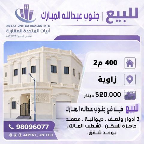 For sale, a villa in South Abdullah Al-Mubarak Al-Sabah, corner location, area 400, consisting of 3 floors and a half, diwaniya, elevator, ready for occupancy, owner's finishing, includes apartments. For inquiries, mobile 1, price 520 thousand dinars, code 4.