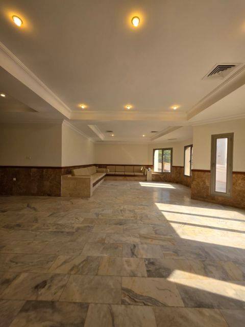For rent in Al-Rumaithiya, a full floor (spacious) with 4 master bedrooms. Details for families seeking independence and spacious areas. A full floor in Al-Rumaithiya with super deluxe finishing, featuring high privacy (private entrance) and smart space distribution. Floor layout and features: reception hall - very large and open hall that easily accommodates two sofa sets and a dining table. It features an arched entrance that gives character, with ceiling decorations and lighting.