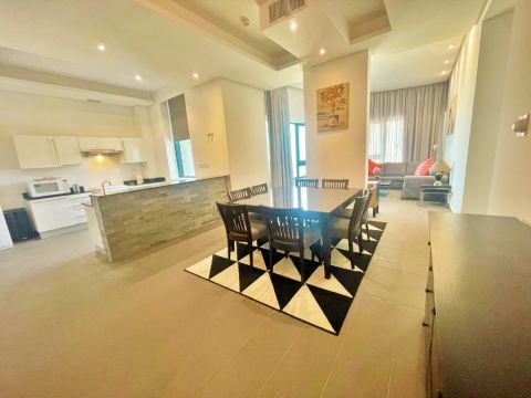 Luxurious fully furnished 1 - bedroom apartment for rent in a nice location in Salwa near Gulf Road. It has a spacious living room with a fully equipped American kitchen, a nice bedroom with a large private terrace, and a nice big bathroom. Great finishes and fixtures are offered, along with facilities such as a swimming pool, gym, WiFi, and twice - weekly housekeeping. Strictly for expats only rent
