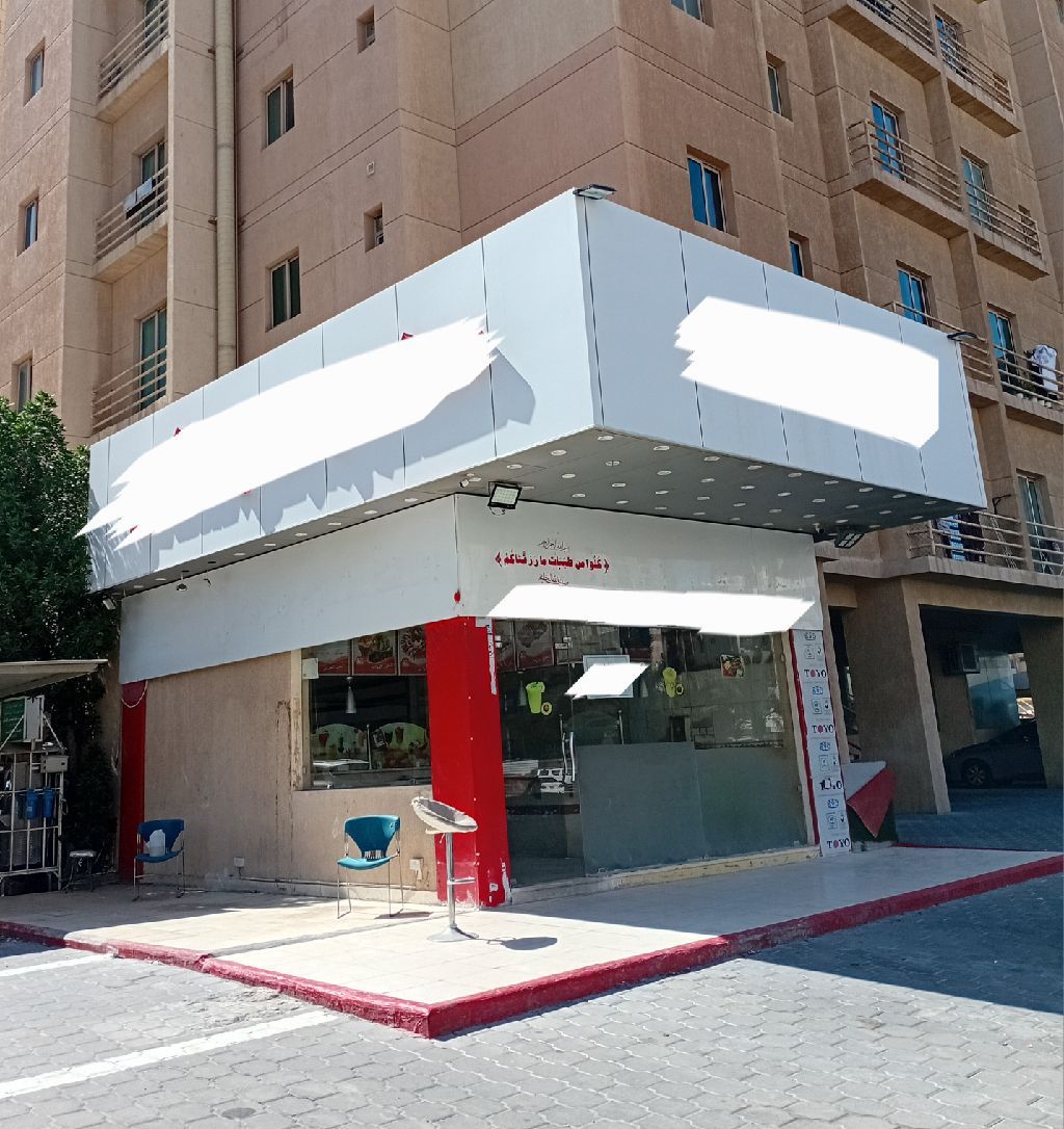 For rent: a shop in Salmiya, on a main corner street, suitable for any activity except a car workshop, equipped for a restaurant, with a car setback in front of it. The shop area is 40 square meters, the rent is 1500, there is a grace period, and the commission is half a month.