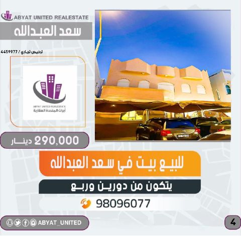 For sale: A house in Saad Al-Abdullah city with an area of 400 square meters, consisting of two floors and a quarter. For inquiries, mobile number 1. Price: 290 thousand dinars. Code: 4