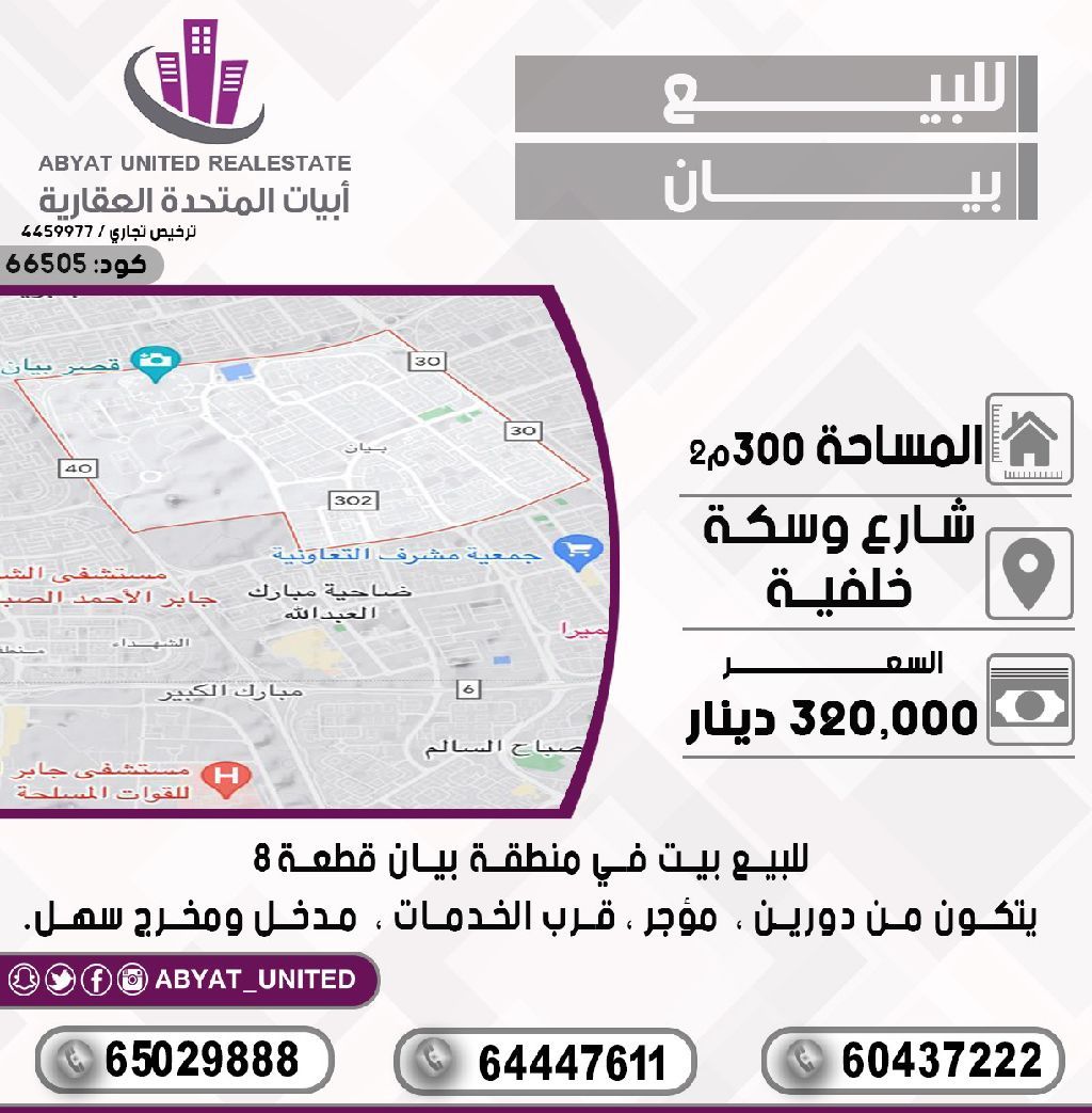 للبيع: بيت في منطقة بيان، قطعة 8. الموقع يضم شارع وسكة خلفية. المساحة 300 متر مربع. يتكون من دورين. مؤجر وقريب من الخدمات. مدخل ومخرج سهل. للاستفسار، اتصل على النقال 1، النقال 2، النقال 3. السعر 320 ألف دينار. الكود: 66505.