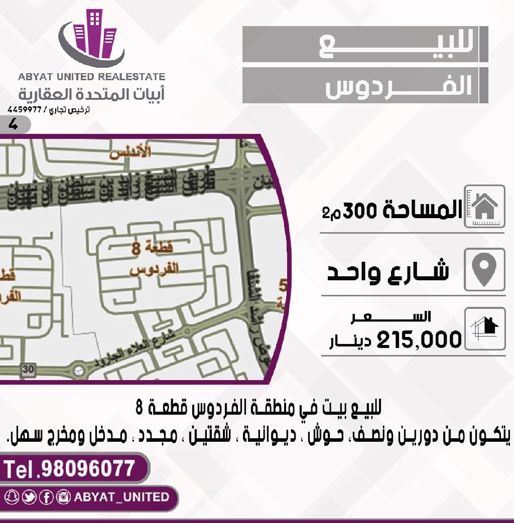 للبيع: بيت في منطقة الفردوس، قطعة 8، يقع على شارع واحد. المساحة 300 متر مربع. يتكون من دورين ونصف، حوش، ديوانية، شقتين، وهو مجدد. مدخل ومخرج سهل. للاستفسار، اتصل بالرقم 1. السعر: 215,000 دينار. الكود: 4.