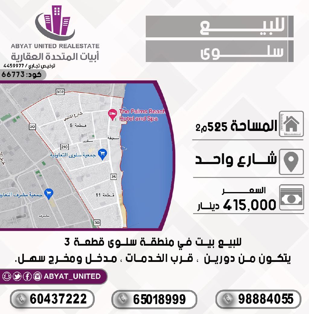 للبيع: بيت في منطقة سلوى، قطعة 2، يقع على شارع واحد. المساحة 525 متر مربع، يتكون من دورين، قرب الخدمات، مع مدخل ومخرج سهل. للاستفسار، اتصل على النقال 1، النقال 2، النقال 3. السعر: 415 ألف دينار. الكود: 66773.