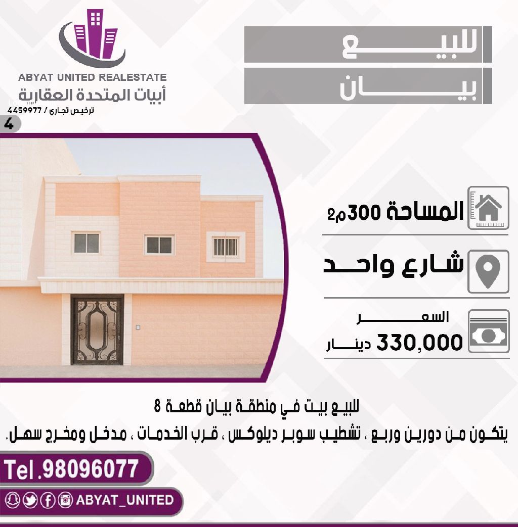 للبيع: بيت في منطقة بيان، قطعة 8، يقع على شارع واحد. المساحة 300 متر مربع، يتكون من دورين وربع، بتشطيب سوبر ديلوكس، قرب الخدمات، ومدخل ومخرج سهل. للاستفسار، اتصل على النقال 1. السعر: 330 ألف دينار. الكود: 4.