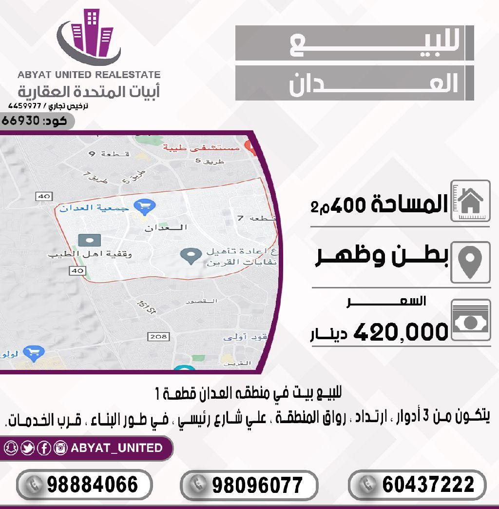 للبيع: بيت في منطقة العدان، قطعة 1 الموقع، بطن وظهر. المساحة: 400 متر مربع، يتكون من 3 أدوار، ارتداد، رواق المنطقة، على شارع رئيسي، في طور البناء، قرب الخدمات. للاستفسار: النقال 1، النقال 2، النقال 3. السعر: 420 ألف دينار. الكود: 66930.