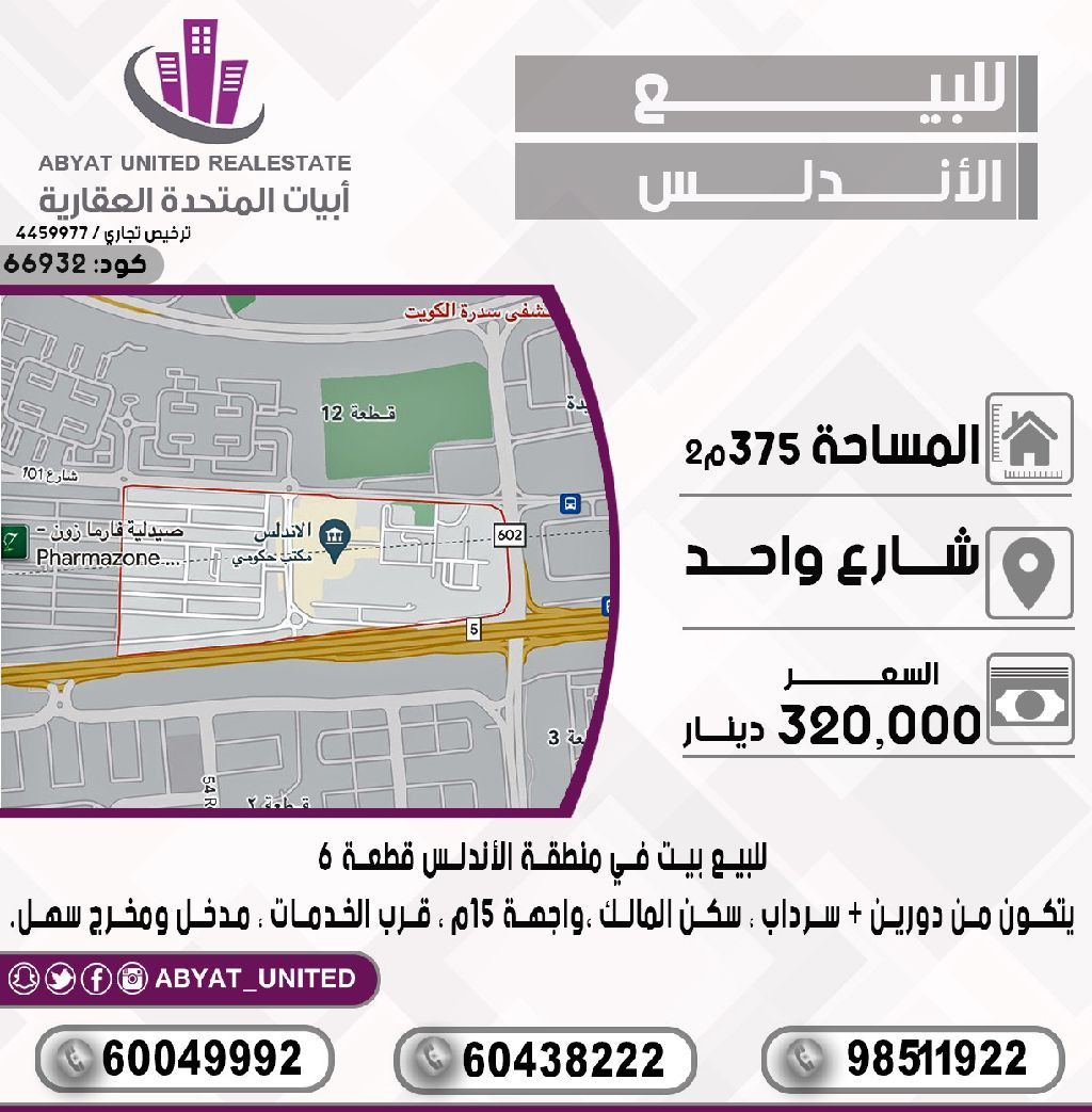 للبيع: بيت في منطقة الأندلس، قطعة 6. الموقع: شارع واحد، المساحة 375 م²، يتكون من دورين، سرداب، سكن المالك، واجهة 15 م، مدخل ومخرج سهل، قرب الخدمات. للاستفسار: النقال 1، النقال 2، النقال 3. السعر: 320 ألف دينار. الكود: 66932.