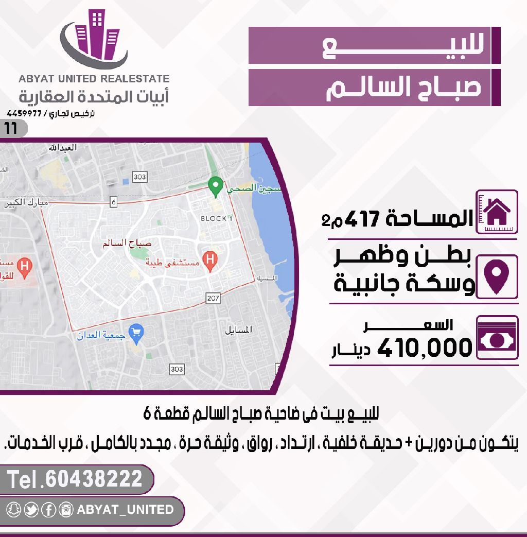 للبيع: بيت في ضاحية صباح السالم، قطعة 6، موقع بطن وظهر وسكة جانبية. المساحة: 417 متر مربع. يتكون من دورين، حديقة خلفية، ارتداد، رواق، وثيقة حرة، مجدد بالكامل، وقرب الخدمات. للاستفسار، النقال 1. السعر: 410 ألف دينار. كود 11.