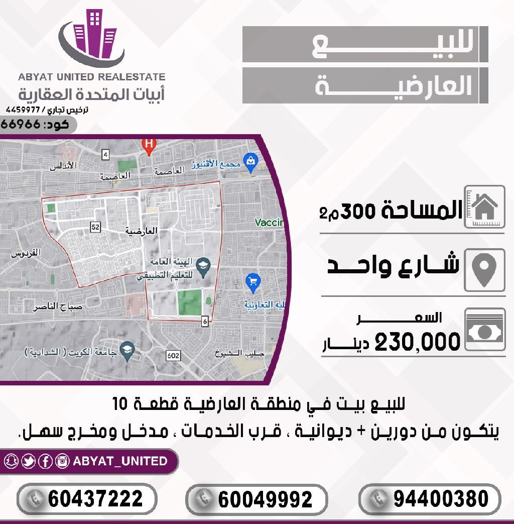 للبيع: بيت في العارضية، قطعة 10. الموقع: شارع واحد. المساحة: 300 متر مربع. يتكون من دورين، ديوانية، قرب الخدمات، مدخل ومخرج سهل. للاستفسار: النقال 1، النقال 2، النقال 3. السعر: 230 ألف دينار. الكود: 66966.