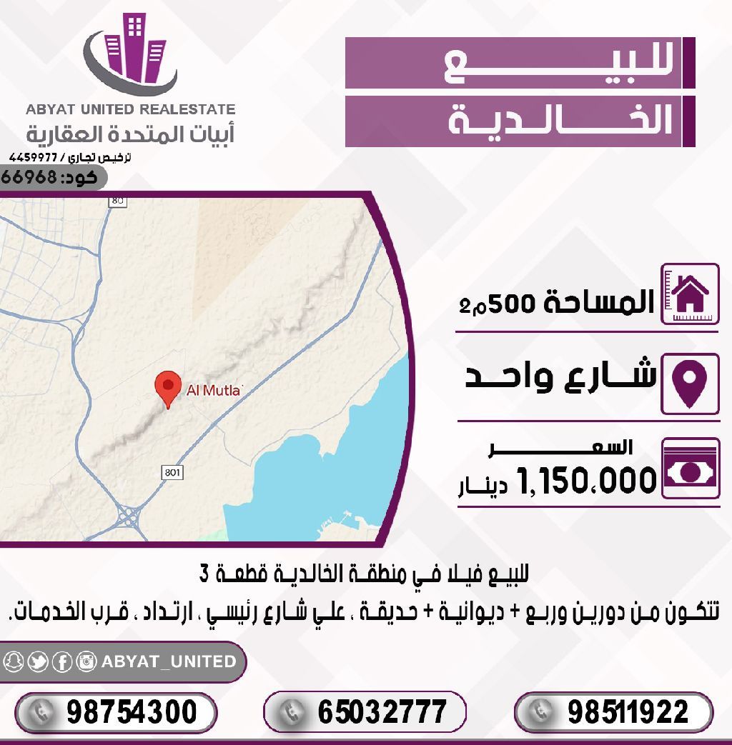للبيع: فيلا في منطقة الخالدية، قطعة 3. الموقع: شارع واحد، المساحة: 500 م²، تتكون من دورين وربع، ديوانية، حديقة، على شارع رئيسي، ارتداد، قرب الخدمات. للاستفسار: النقال 1، النقال 2، النقال 3. السعر: 1,150,000 دينار. الكود: 66968.