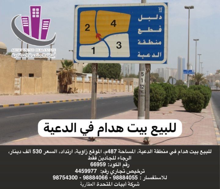 للبيع: بيت هدام في منطقة الدعية، المساحة 487 متر مربع، موقع زاوية، ارتداد. السعر: 530,000 دينار كويتي. للجادين فقط. رقم الكود: 66959. رقم الترخيص التجاري: 4459977. للاستفسار - شركة أبيات المتحدة العقارية.