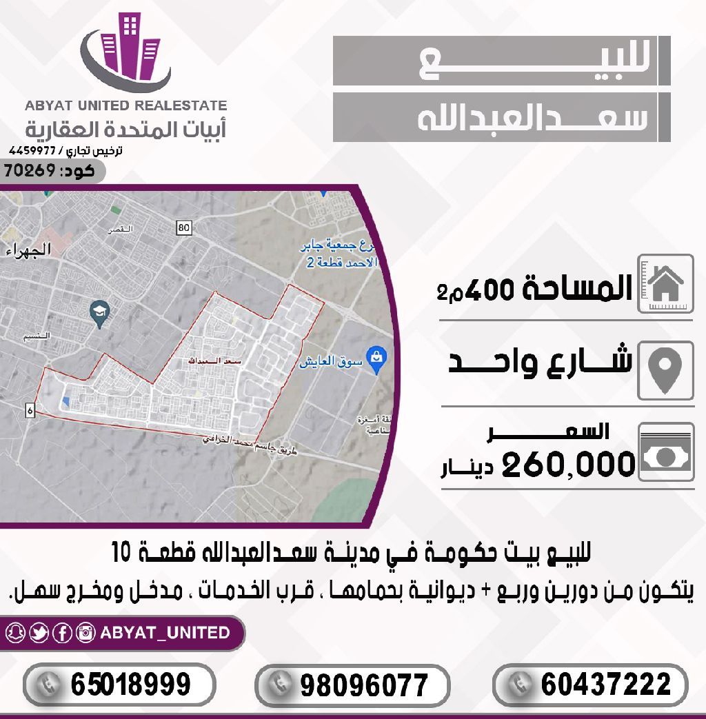 للبيع: بيت حكومة في مدينة سعد العبدالله، قطعة 10. الموقع: شارع واحد. المساحة: 400 متر مربع. يتكون من دورين وربع، ديوانية بحمامها، مدخل ومخرج سهل، قرب الخدمات. للاستفسار: النقال رقم 1، النقال رقم 2، النقال رقم 3. السعر: 260 ألف دينار. الكود: 70269.