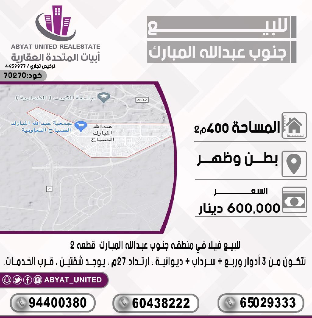 للبيع: فيلا في منطقة جنوب عبدالله المبارك الصباح، قطعة 2. الموقع مركزي وسهل الوصول. المساحة 400 متر مربع. تتكون من 3 أدوار وربع، سرداب، ديوانية، ارتداد 27 متر، تحتوي على شقتين، وقريبة من الخدمات. للاستفسار، اتصل بالرقم النقال 1، الرقم النقال 2، الرقم النقال 3. السعر 600000 دينار كويتي. الكود 70270.