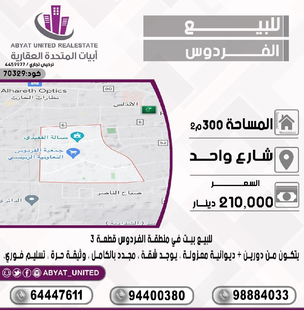 للبيع: بيت في منطقة الفردوس، قطعة 3، يقع على شارع واحد. المساحة: 300 متر مربع. يتكون من دورين، ديوانية معزولة، يحتوي على شقة، مجدد بالكامل، وثيقة حرة، تسليم فوري. للاستفسار: النقال رقم 1، النقال رقم 2، النقال رقم 3. السعر: 210 ألف دينار. الكود: 70329.