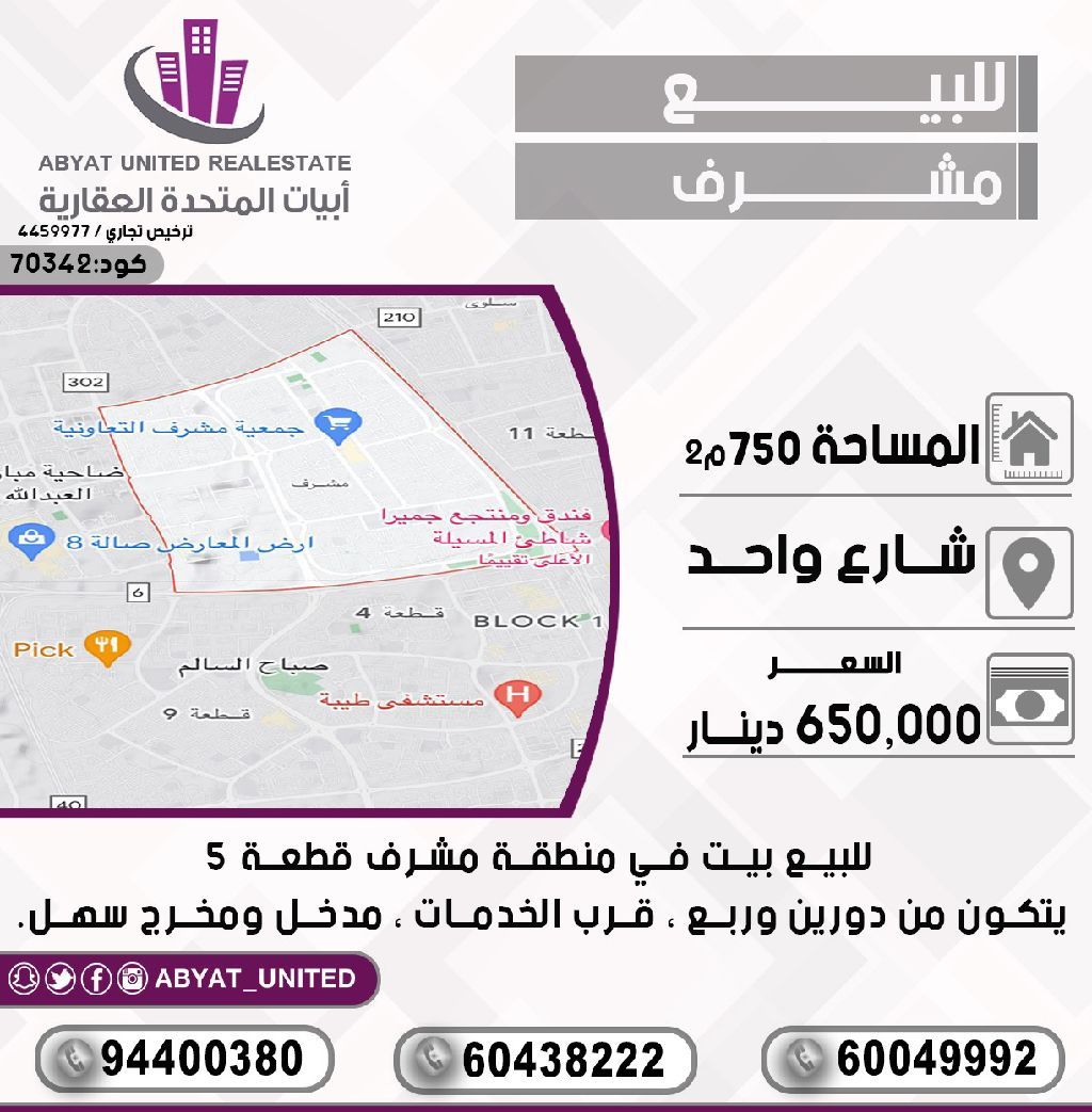 للبيع: بيت في منطقة مشرف، قطعة 5. الموقع: شارع واحد. المساحة: 750 متر مربع. يتكون من دورين وربع، قرب الخدمات، مدخل ومخرج سهل. للاستفسار، النقال رقم 1، النقال رقم 2، النقال رقم 3. السعر: 650 ألف دينار. الكود: 70342.