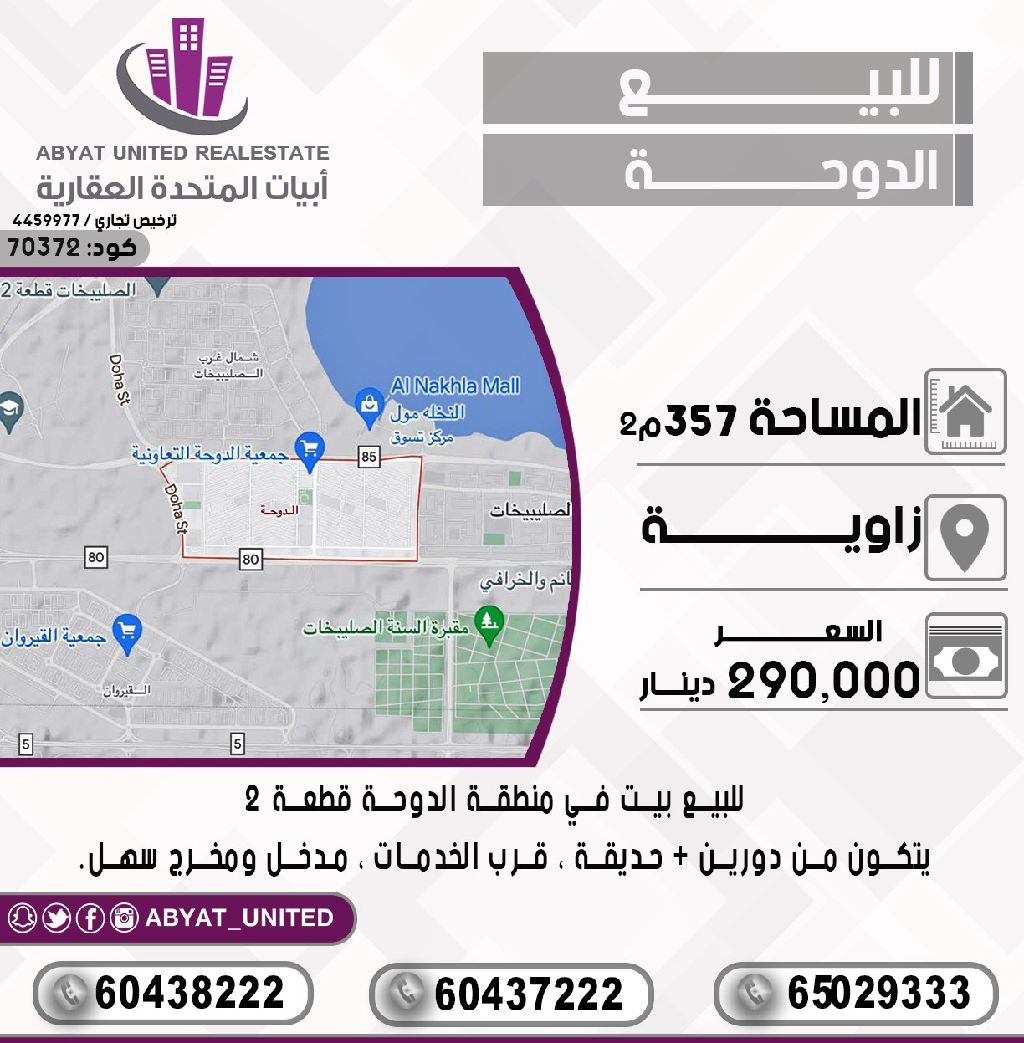 للبيع: بيت في منطقة الدوحة، قطعة 2، موقع زاوية. المساحة: 357 متر مربع. يتكون من دورين، حديقة، مدخل ومخرج سهل، وقرب الخدمات. للاستفسار، أرقام النقال: 1، 2، 3. السعر: 290 ألف دينار. الكود: 70372.