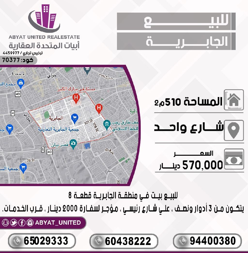 للبيع: بيت في منطقة الجابرية، قطعة 8، يقع على شارع واحد. المساحة 510 متر مربع، يتكون من 3.5 أدوار، على شارع رئيسي، مؤجر لسفارة بمبلغ 2000 دينار، قرب الخدمات. للاستفسار، النقال رقم 1، النقال رقم 2، النقال رقم 3. السعر: 570,000 دينار. الكود: 70377.