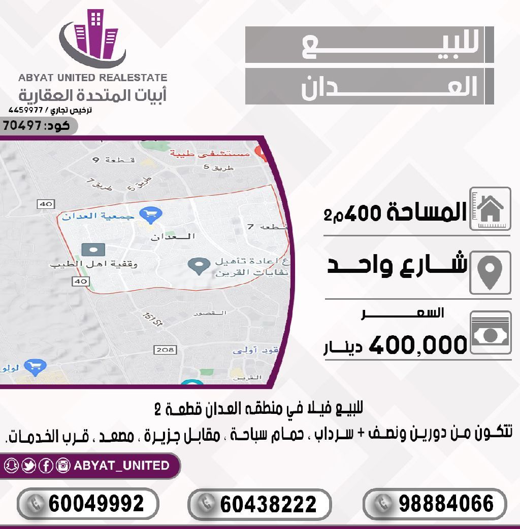 للبيع: فيلا في منطقة العدان، قطعة 2، تقع على شارع واحد. المساحة 400 متر مربع، تتكون من دورين ونصف، سرداب، حمام سباحة، مقابل جزيرة، مصعد، وقرب الخدمات. للاستفسار، النقال رقم 1، النقال رقم 2، النقال رقم 3. السعر: 400 ألف دينار. الكود: 70497.