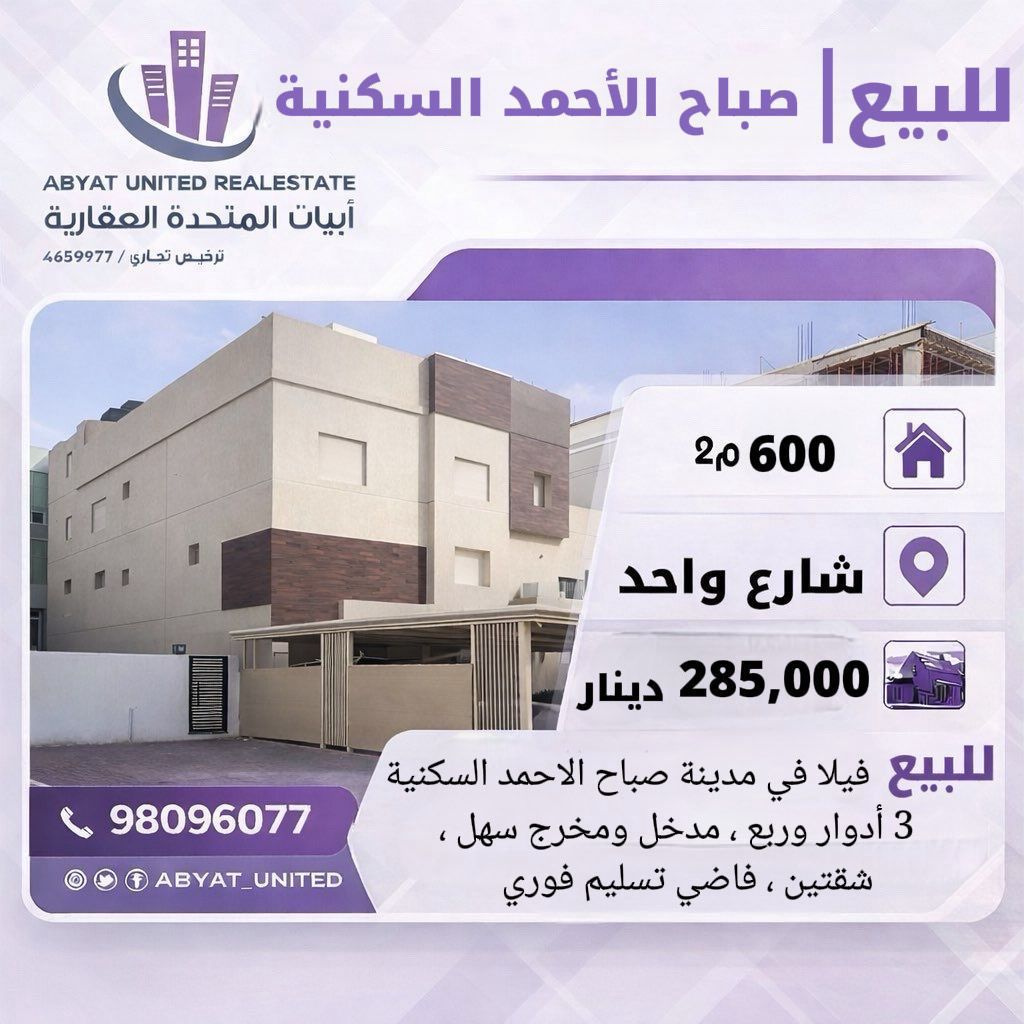 للبيع فيلا في مدينة صباح الأحمد السكنية. الموقع: شارع واحد. المساحة: 600 متر مربع. تتكون من 3 أدوار وربع، مدخل ومخرج سهل، شقتين، فاضي تسليم فوري. للاستفسار النقال رقم 1. السعر: 285 ألف دينار. الكود: 4.