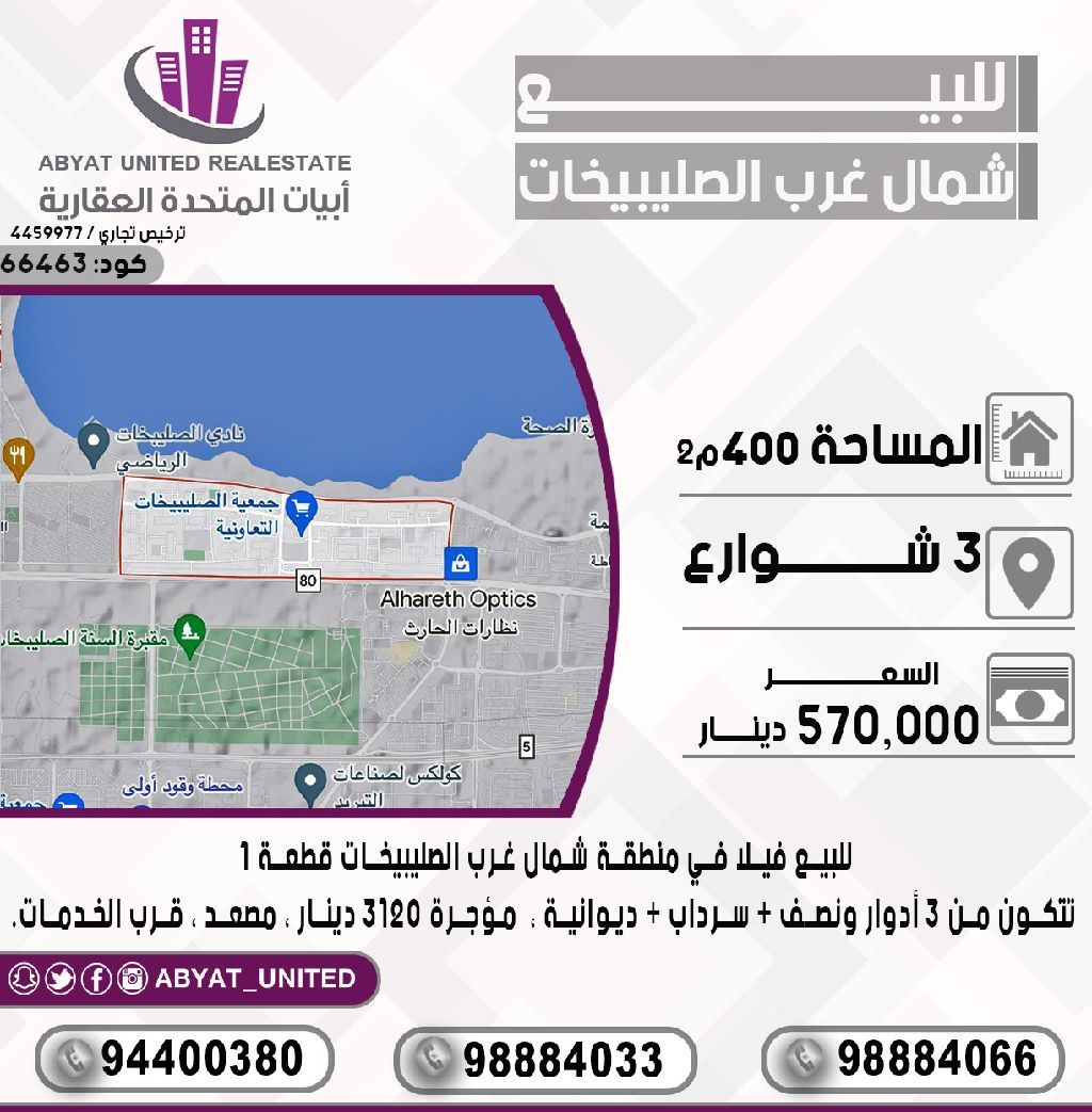 For sale: A villa in the Northwest Al-Sulaibikhat area, Plot 1 location, with 3 street frontages. The area is 400 square meters. It consists of 3.5 floors, a basement, a diwaniya, and is rented for 3120 dinars. It has an elevator and is near services. For inquiries, call Mobile 1, Mobile 2, Mobile 3. The price is 570,000 dinars. Code 66463.