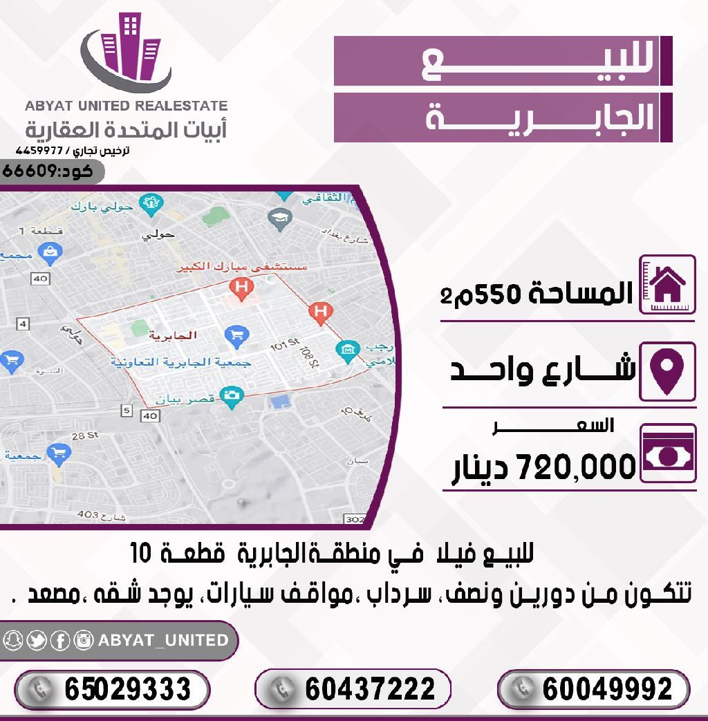 For sale: A villa in the Jabriya area, Plot 10. Location: One street. Area: 550 square meters. It consists of two and a half floors, a basement, car parking, includes an apartment, and an elevator. For inquiries, call Mobile 1, Mobile 2, Mobile 3. Price: 720,000 dinars. Code: 66609.