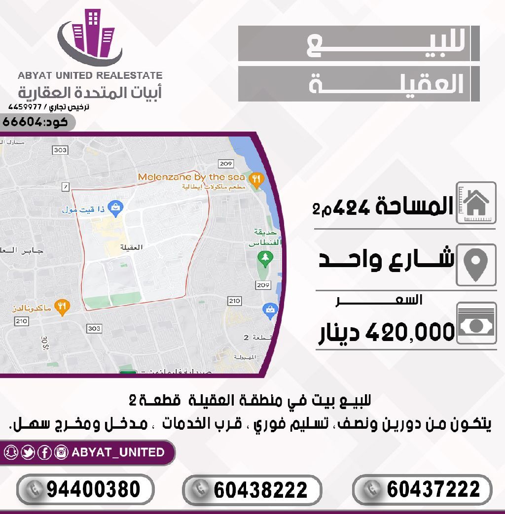For sale: A house in the Aqila area, Plot 2. Location: One street. Area: 424 square meters. It consists of two and a half floors. Immediate delivery. Easy access and exit. For inquiries, Mobile 1, Mobile 2, Mobile 3. Price: 420,000 dinars. Code: 66604.