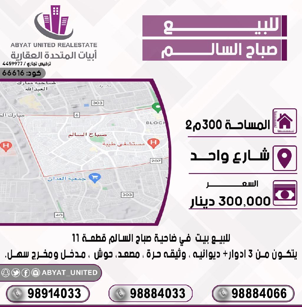For sale: A house in the Sabah Al-Salem suburb, Plot 11. Location: One street. Area: 300 square meters. It consists of 3 floors, a diwaniya (reception area), freehold document, elevator, courtyard, and easy access. For inquiries, call Mobile 1, Mobile 2, Mobile 3. Price: 300,000 dinars. Code: 66616.
