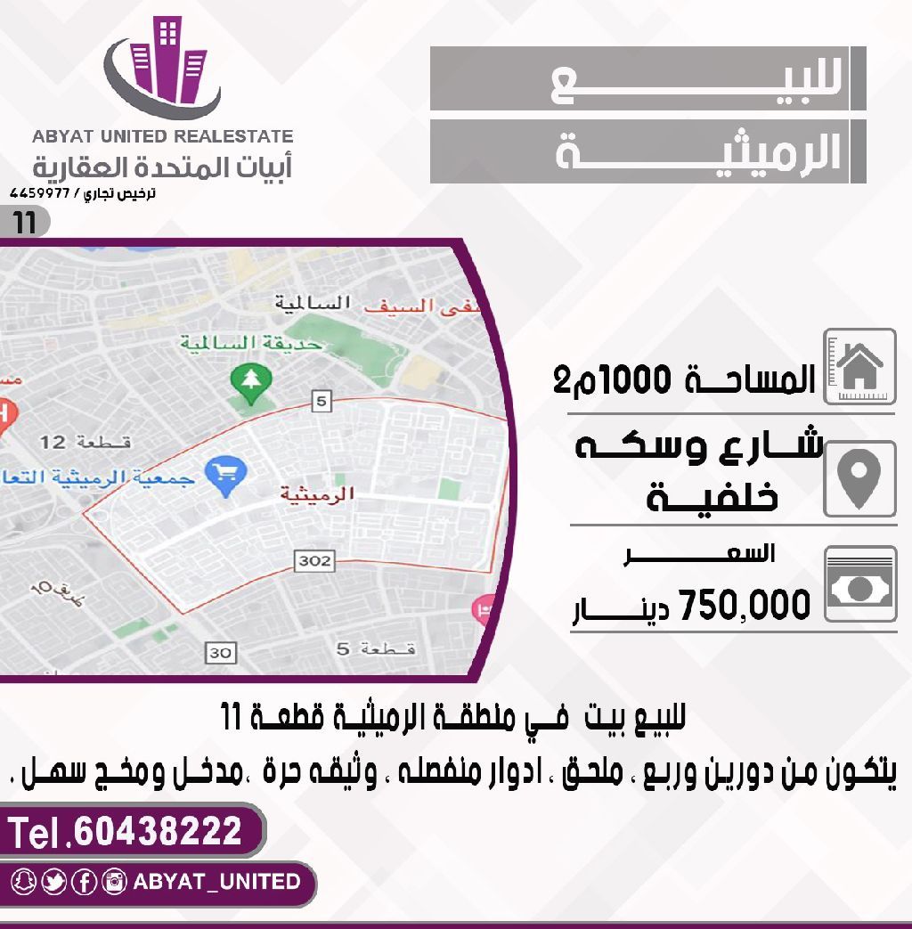 For sale: A house in the Rumaithiya area, plot 11. The location is on a street with a back alley. The area is 1000 square meters. It consists of two floors and a quarter, an annex, separate floors, a freehold document, and an easy entrance and exit. For inquiries, mobile number 1. The price is 750 thousand dinars. Code 11.