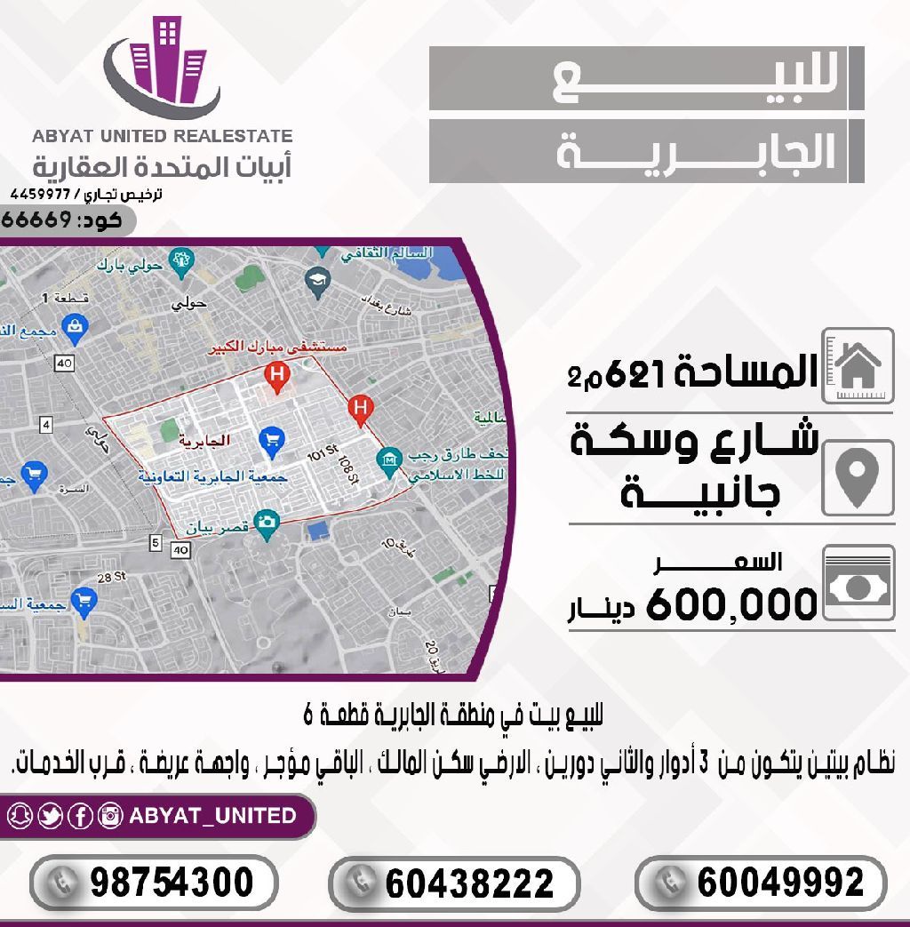 For sale: A house in the Jabriya area, Block 6. Location: on a street with a side alley. Area: 612 square meters. It is a two-house system consisting of 3 floors and the second with 2 floors. The ground floor is owner-occupied, and the rest is rented. It has a wide facade and is close to services. For inquiries, call Mobile 1, Mobile 2, Mobile 3. Price: 600,000 Kuwaiti Dinars. Code: 66669.