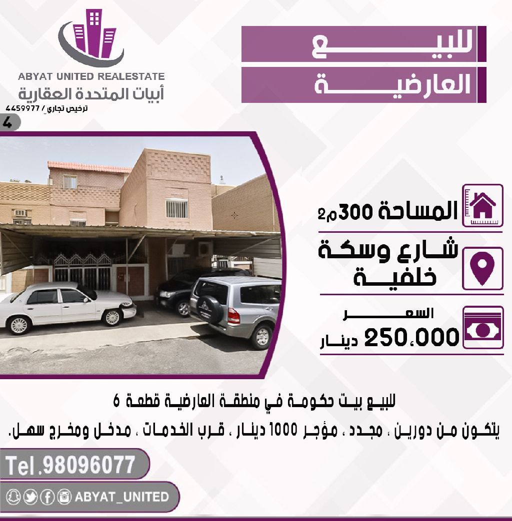 For sale: A government house in the Al-Ardiya area, Block 6. The location features a street and a back alley. The area is 300 square meters. It consists of two floors, is renovated, and is rented for 100 dinars. It is near services and has easy access. For inquiries, call mobile number 1. The price is 250,000 dinars. Code 4.