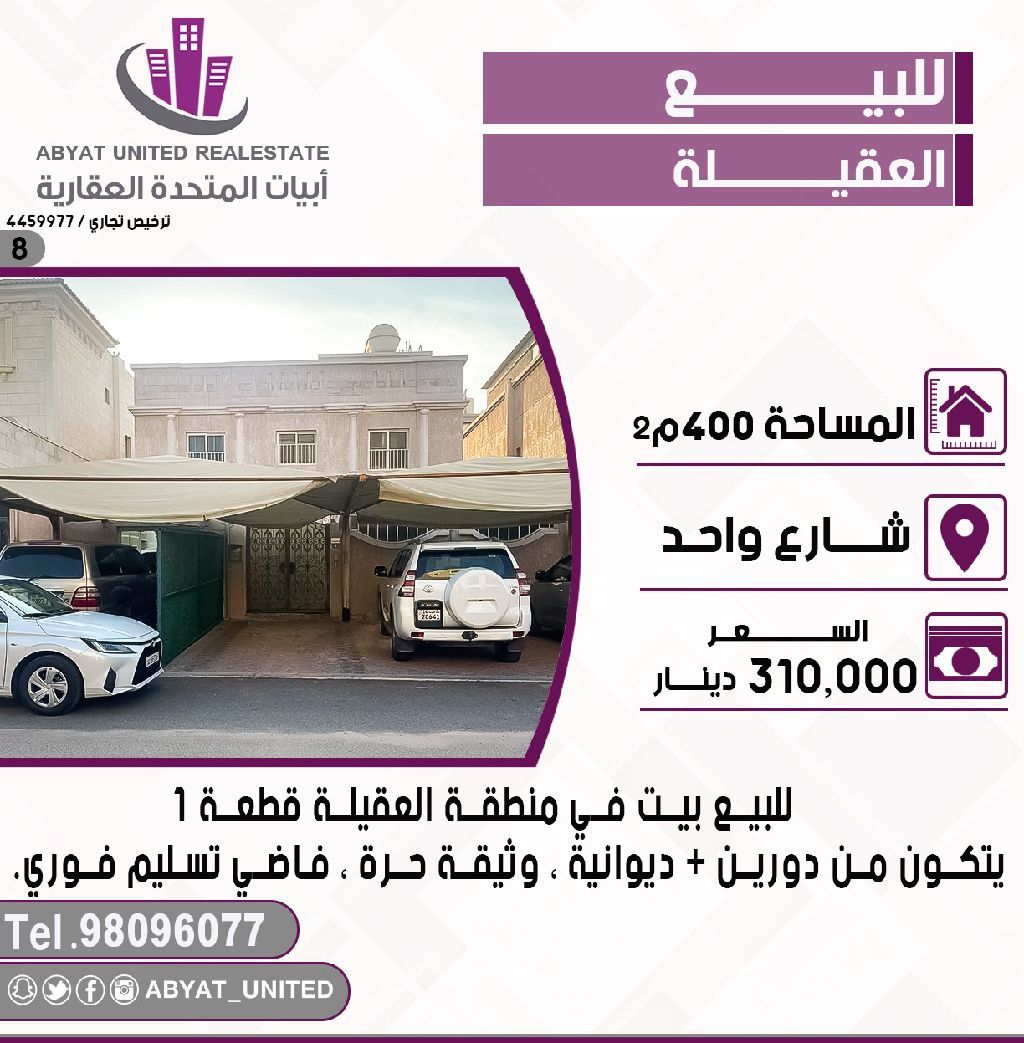 For sale: A house in the Aqaila area, Plot 1, located on a single street. The area is 400 square meters, consisting of two floors, a diwaniya (reception area), with a freehold title deed, vacant, and ready for immediate delivery. For inquiries, call mobile number 1. The price is 310,000 dinars. Code 4.