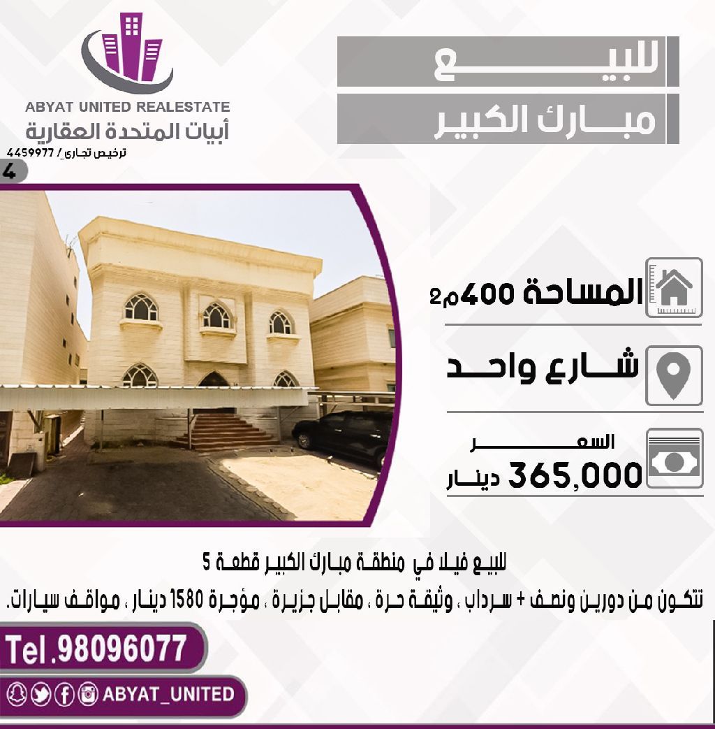 For sale: A villa in Mubarak Al-Kabeer area, Block 5, located on a single street. The area is 400 square meters, consisting of two and a half floors, a basement, and is a freehold property. It is opposite an island, currently rented for 1580 dinars, with car parking. For inquiries, call mobile number 1. Price: 365,000 dinars. Code: 4.