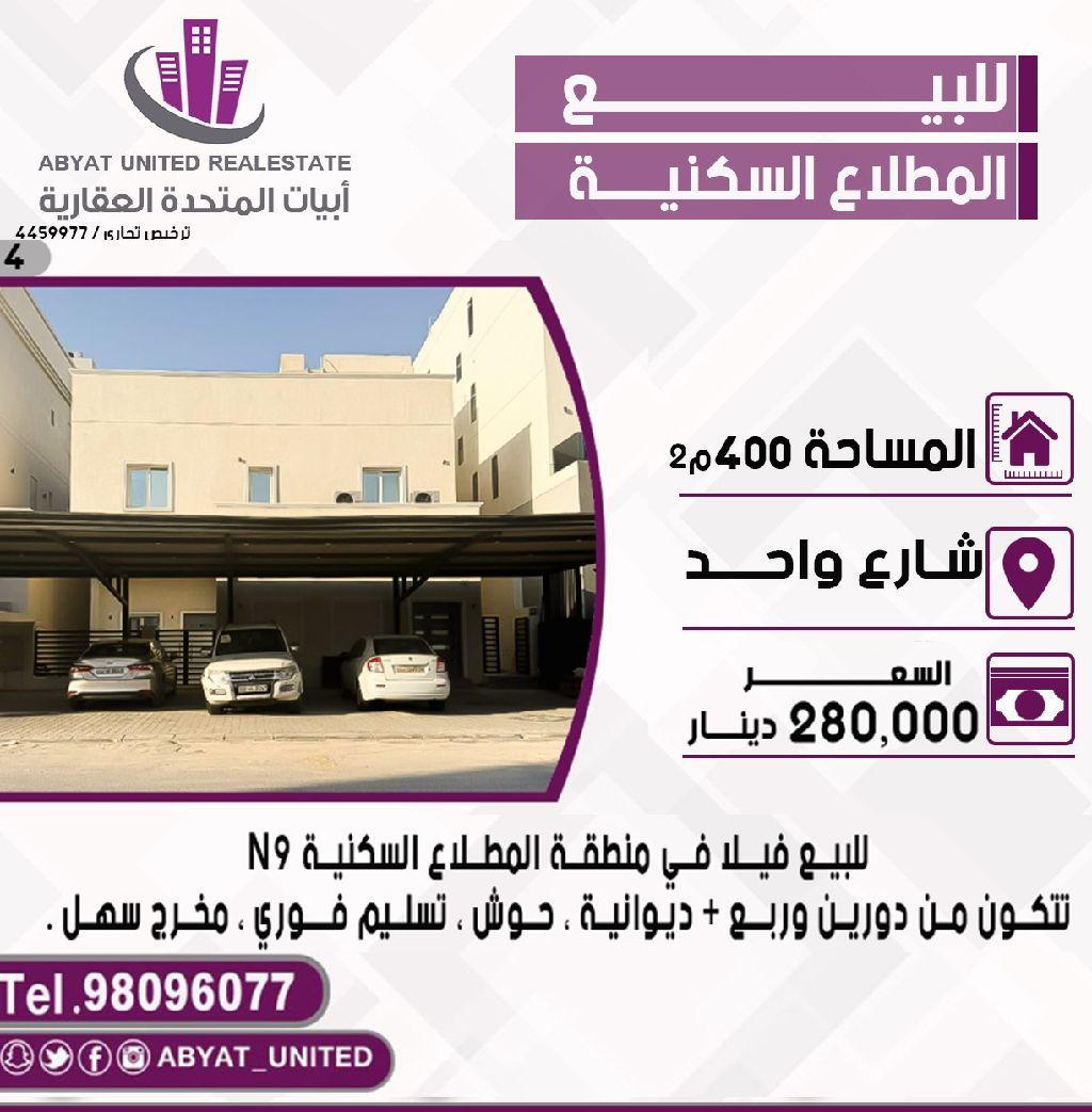 For sale: A villa in the Al-Mutlaa residential area, N9 location, on a single street. The area is 400 square meters, consisting of two and a quarter floors, a diwaniya (reception area), a courtyard, and immediate delivery. Easy access and exit. For inquiries, call mobile number 1. Price: 280,000 dinars. Code: 4.