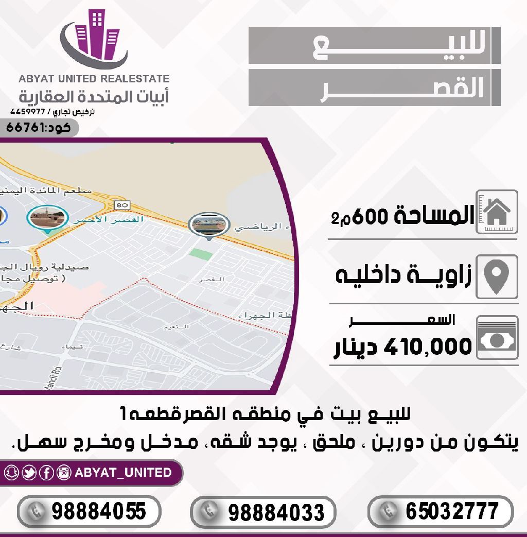 For sale: A house in the Al-Qasr area, Plot 1. The location is an internal corner. The area is 600 square meters. It consists of two floors, an annex, and includes an apartment. Easy access and exit. For inquiries, call Mobile 1, Mobile 2, Mobile 3. Price: 410,000 dinars. Code: 66761.