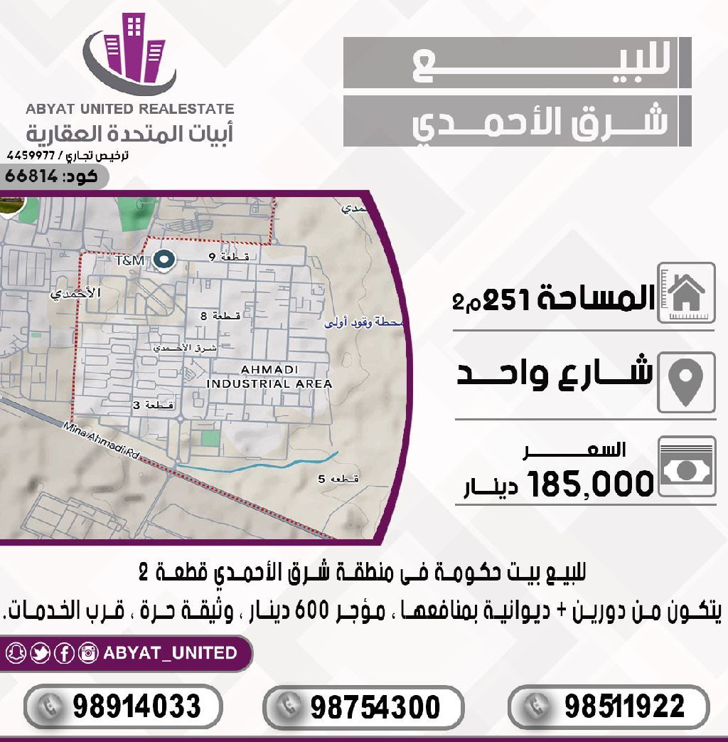 For sale: A government house in East Ahmadi, Block 2, located on a single street. The area is 251 square meters, consisting of two floors, with a diwaniya and its utilities. It is rented for 600 dinars, has a free deed, and is near services. For inquiries, contact Mobile 1, Mobile 2, Mobile 3. Price: 185,000 dinars. Code: 66814.