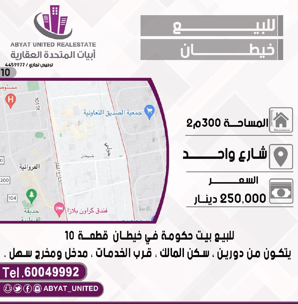 For sale: A government house in the Khaitan area, plot 10, with an area of 300 square meters. The location is on a single street, consisting of two floors, owner-occupied, near services, with easy access. For inquiries, mobile number 1. Price: 250,000 Kuwaiti dinars, code 10.