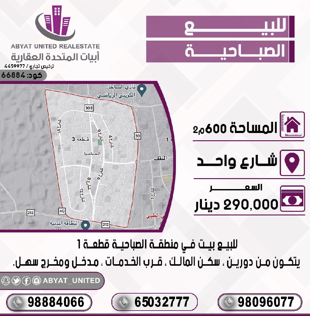 For sale: A house in the Sabahiya area, Plot 1 location, one street, area 600 m², consisting of two floors, owner-occupied, near services, easy entrance and exit. For inquiries: Mobile 1, Mobile 2, Mobile 3. Price: 290,000 dinars. Code: 66884.